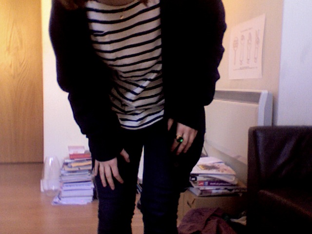 Cardigan: charity shop, Jeans: topshop, T-shirt: ck/vintage, Ring: topshop, Flats: adidasI'm still in love with that cardigan. It's super warm and comfy, I think I'm going to take it with me to Copenhagen instead of a coat. And I don't care it's yellow. And I don't care it's got ducks/goose. And it probably doesn't go well with stripes. Oh well.
